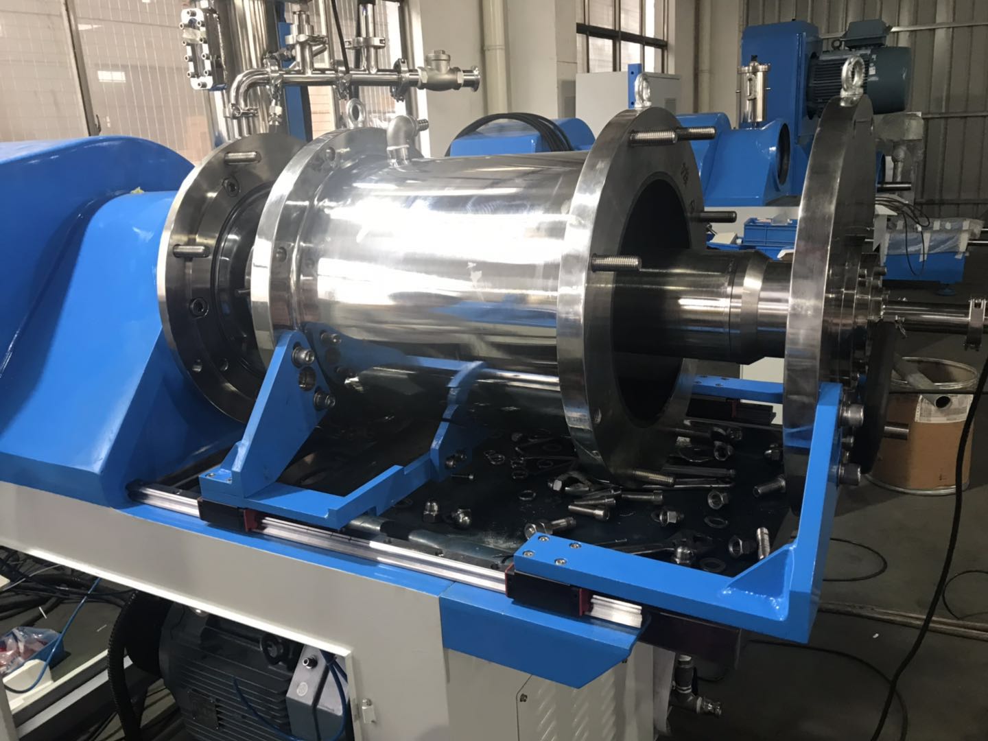 臥式棒銷結(jié)構(gòu),驅(qū)動單元位于研磨腔上方,采用可調(diào)電機(jī)機(jī)座,密度液采用先進(jìn)的不停機(jī)加注裝置,大幅提高了研磨效率。